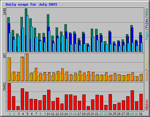 | Day | Hits | Files | Pages | Visits | Sites | KBytes | ||||||